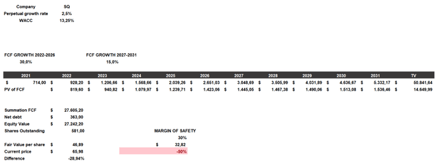 - The growth rates entered are 30% for the first 5 years and 15% for the following 5. I am sure many of you were expecting higher growth rates, but personally I think the ones entered are already too high. If Cash App generated $12.3 billion in 2021 it is because there was a speculative bubble on cryptocurrencies that led many people to invest in it and as a result this benefited the company's coffers tremendously. 81.7% of Cash App's revenues come from bitcoin trading, and I doubt the percentage will be that high in this difficult 2022. With inflation near double digits and a likely recession just around the corner I doubt that investing in bitcoin will be as common as it was in 2021.
