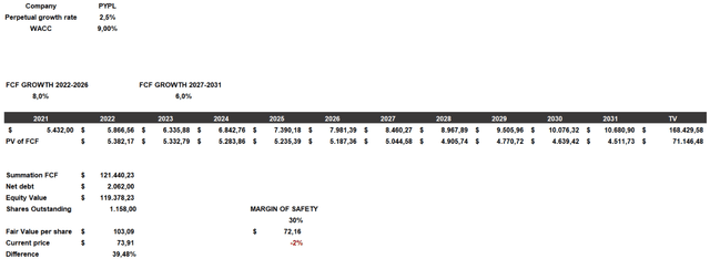 Every investment is the present value of future cash flows, so I will use a discounted cash flow to understand how much PayPal and di Block are worth.