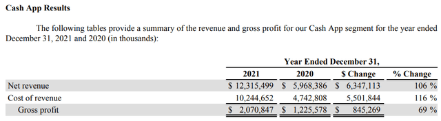 Of the $12.3 billion earned in 2021, 81.7% came from bitcoin trading, about $10 billion. This is the main reason why Cash app is not comparable to PayPal, whose earnings come almost entirely from net transaction fees. With bitcoin 75% far from the all-time high of late 2021 what are the chances that Cash App will have better performance this year? I would say very few.