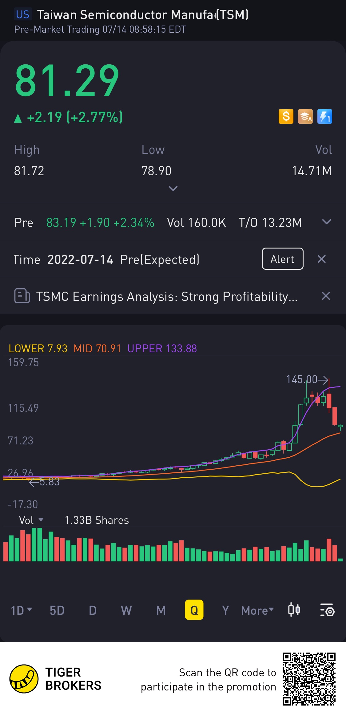 $Taiwan Semiconductor Manufacturing(TSM)$With good earnings yet the share price not moving, probably majority choose to sideline and monitoring the situation due to overall bearish sentiment. @TigerEvents@小虎活动