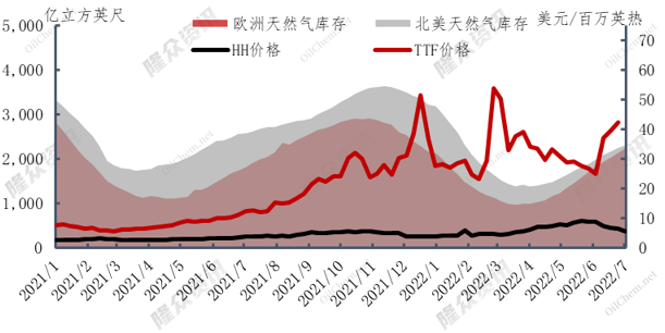 As of the week of July 1, according to the data of the European Natural Gas Infrastructure Association, the European natural gas inventory was 2,229.251 billion cubic feet, up 91.842 billion cubic feet from the previous month, an increase of 4.32%; Inventories were 408.534 billion cubic feet higher than the same period last year, an increase of 22.56%.