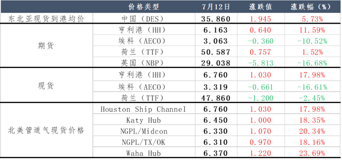 As of July 12, the US natural gas futures price was 6.163 US dollars/million British heat, up 0.64 US dollars/million British heat from the previous cycle (7.5), an increase of 11.59%; Dutch natural gas futures price was USD 50.587/million British heat, up USD 0.757/million British heat or 1.52% from the previous cycle (7.5).