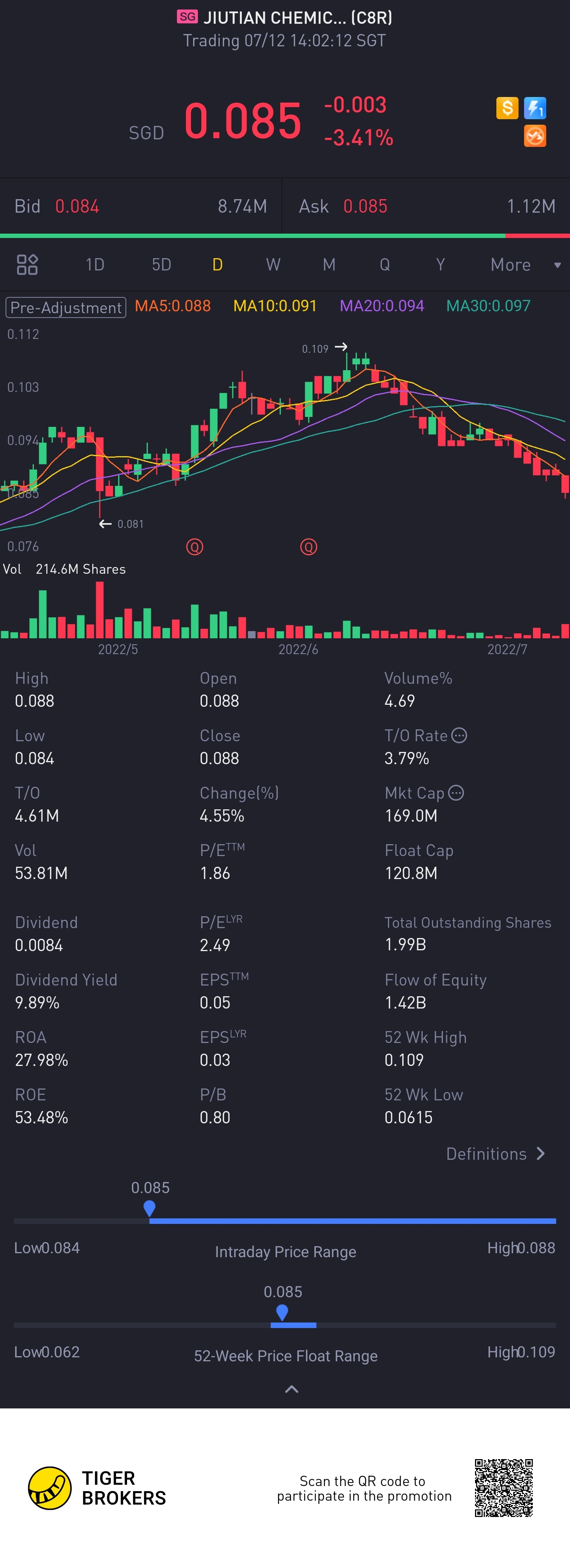 $JIUTIAN CHEMICAL GROUP LIMITED(C8R.SI)$down again