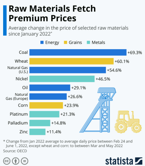 The Statista designed a chart highlighting the Raw Materals( Energy, Grains, Metals) prices changes since January 2022, of which are signigicant impact from the Russian war with Ukraine is significant .