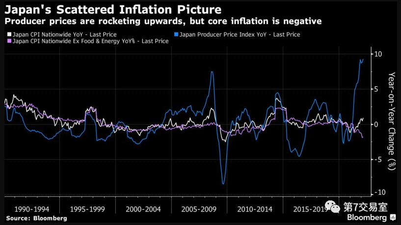 Japan's domestic consumer goods prices (white line) have not yet changed, and PPI raw material prices have soared (blue line) below