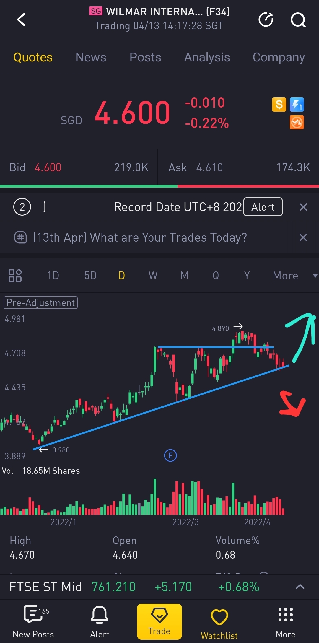 $WILMAR INTERNATIONAL LIMITED(F34.SI)$broke above the ascending triangle but failed to hold above the horizontal breakout line. It is now testing the uptrend line. Bullish if it can bounce off the uptrend line, hence breaking out of the immediate downtrend. Bearish if it breaks and closes below uptrend line.