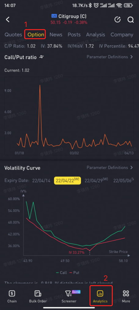 We use all options in the option chain to calculate the 30-days' implied volatility. It means a stock's implied volatility in the next 30 days. Also, we calculate IV/HisV and IV percentile to help to compare whether today's IV is high or low.