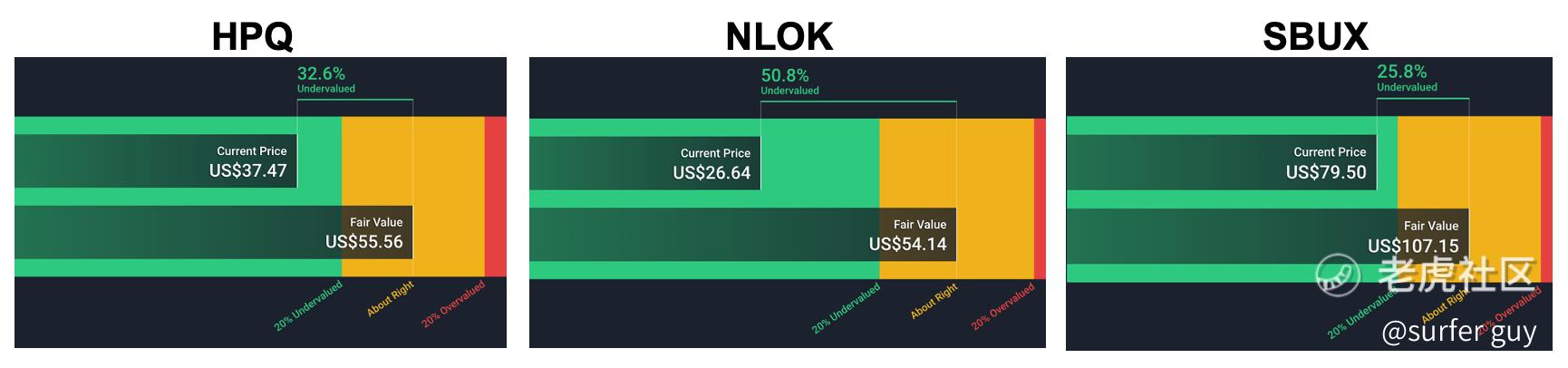 To check if the stock price of the shortlisted 3 are undervalued or not, I use another free to try site Simply Wall St, which estimated the fair value using Discounted Cash Flow (DCF) methods. It showed (below) that NLOK current stock price is undervalued the most, 50.8% from fair value, with HPQ at 32.6% and SBUX at 25.8% undervalued from fair price.