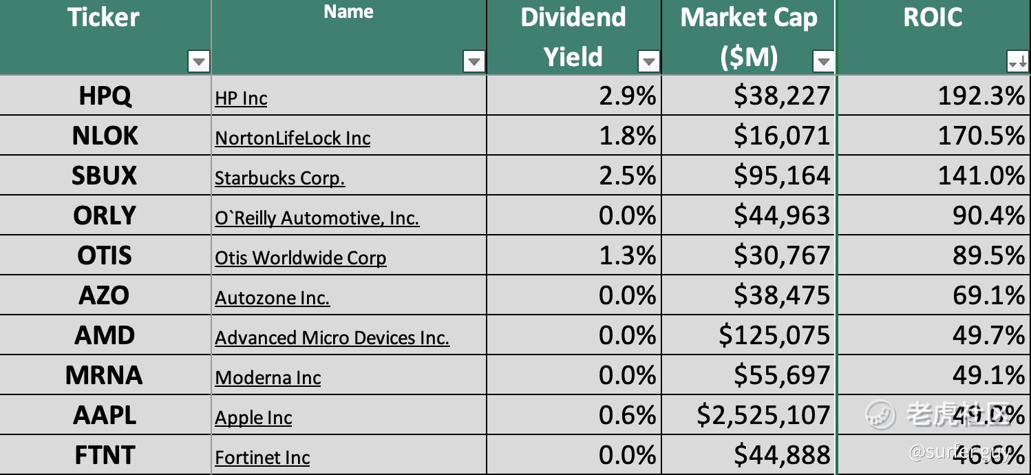 Running a screener from Sure Dividend available free to try online, we obtained a Table (below) with top-10 ranked by ROIC S&P 500 names (big cap, above 11.8bil). Zooming in on the top-3, we shortlisted $HP Inc(HPQ)$, $NortonLifeLock Inc.(NLOK)$ and $Starbucks(SBUX)$ with ROIC ranging from 192.3% to 141%, which also happen to offer dividend yield in the range of 2.9% to 1.8%. Of course, for both ROIC and dividend yield, the higher the better!