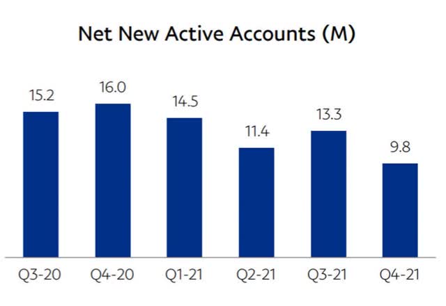 PayPal added an average of 9.35 million new active accounts organically in each quarter of 2019, implying that the 6.6 million organic accounts added in 4Q-21 were 30% lower than the Pre-Covid-19 baseline.