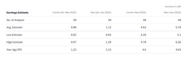 PayPal anticipates non-GAAP earnings per share of $4.60-$4.75 this year, assuming no recession. On average, the market forecasts $4.63 in earnings per share for 2022. Despite a 50% drop in value this year, PayPal's stock still has a P/E ratio of 20x.