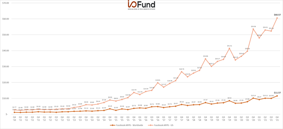 If you look at the graph above, you’ll see something began to change for Facebook’s ARPU around the year 2016. Interestingly enough, user growth on Facebook flatlined a while back and yet average revenue per user skyrocketed.