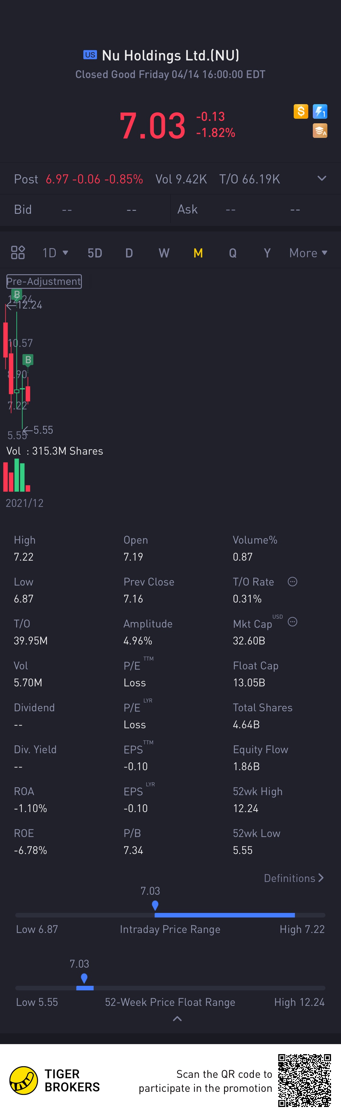 $Nu Holdings Ltd.(NU)$I am all In but now waiting at 5.6 - 5.8 for double bottom purchase
