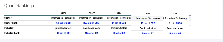 Chart 4 shows the Seeking Alpha Quant Rankings of these five companies. ON Semi has the best sector rank of 8th out of 588 in the Information Technology and 4th out of 62 in the Semiconductor Industry. Micron was a close second ranking 16/588 and 6/62.