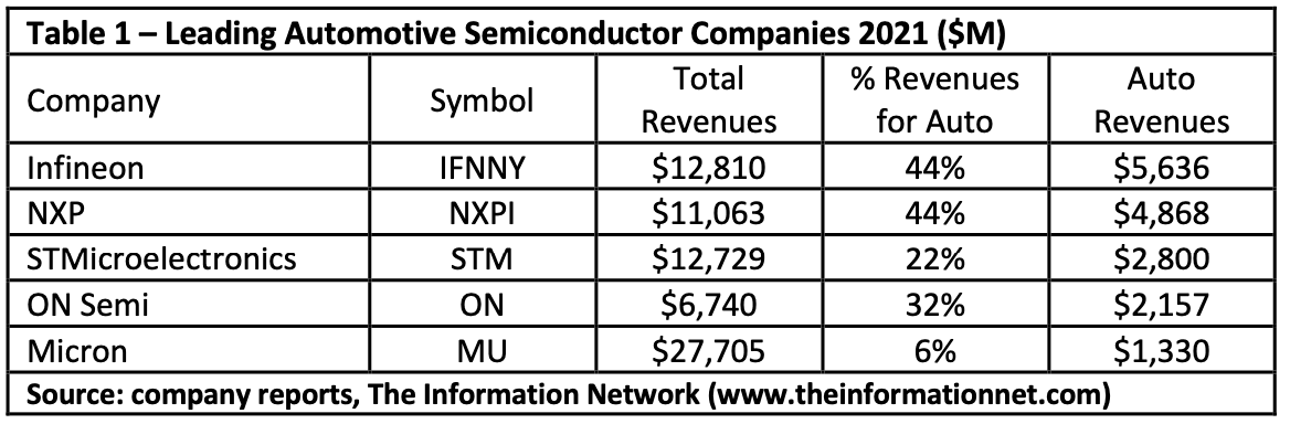 Table 1 lists five of the leading semiconductor companies based on automotive revenues for 2021.