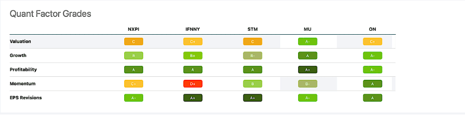 In Quant Rankings, Micron ranked highest, particularly Profitability, as shown in Chart 5. On Semi was next, but with a C+ in valuation, affecting its overall ranking.
