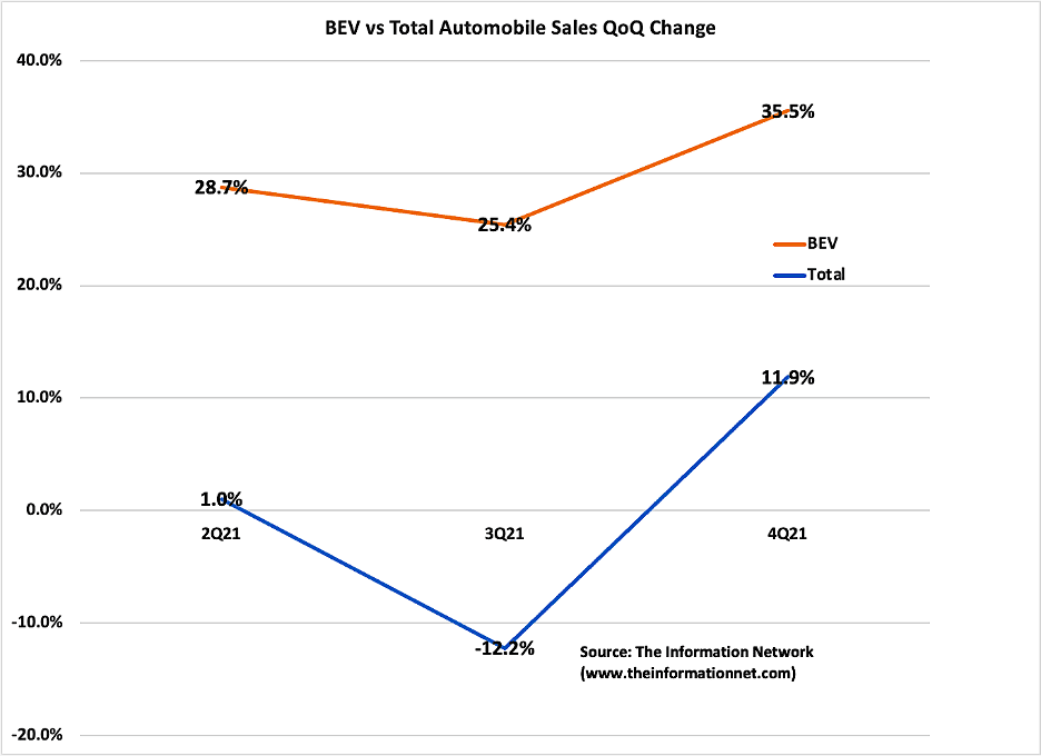 Global light vehicle unit sales are transitioning from ICE (internal combustion engine) to EV (electric vehicles). Chart 1 shows that the QoQ change in the past three quarters of 2021 of BEV (battery EV) shipments was significantly greater than overall automobile shipments.