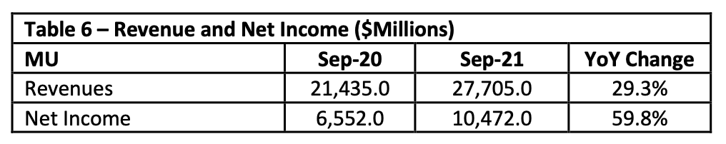 Table 6 shows that Micron's revenues increased 29.3% in 2021 and net income increased 59.8% YoY.