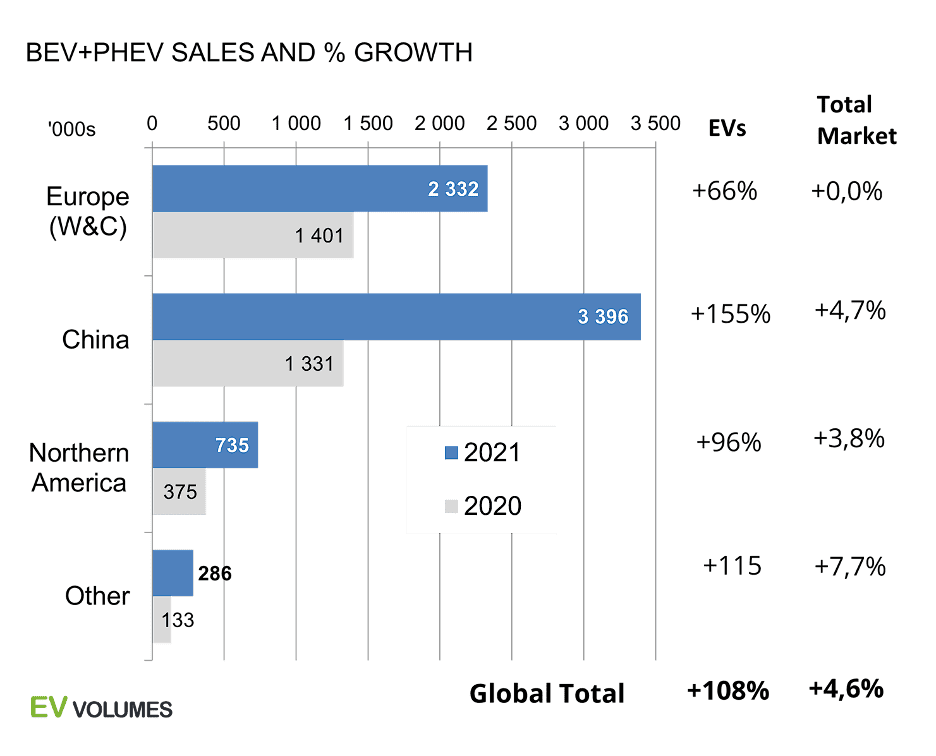 Chart 2 shows that BEV + PHEV (plug-in hybrid vehicle) total light vehicle sales recovering by only 4.6% from the crisis year of 2020, the 108% growth of EVs means doubling their market share.