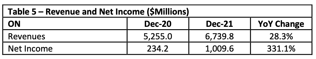 Table 5 shows that On Semis' revenues increased 28.3% in 2021 and net income increased 331.1% YoY.