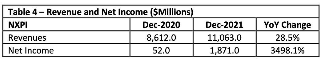 Table 4 shows that NXPI's revenues increased 28.5% in 2021 and net income increased 3,498.1% YoY.