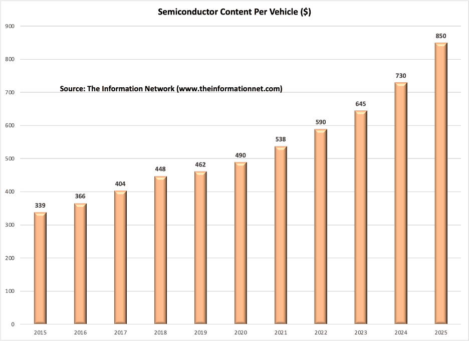 Not only are vehicle shipments and revenue recovering, but more semiconductors are being used each year, as shown in Chart 3, according to The Information Network's report entitled "Hot ICs: A Market Analysis of Artificial Intelligence ("AI"), 5G, Automotive, and Memory Chips." The automotive semiconductor market will be one of the leading drivers to the overall global semiconductor market.
