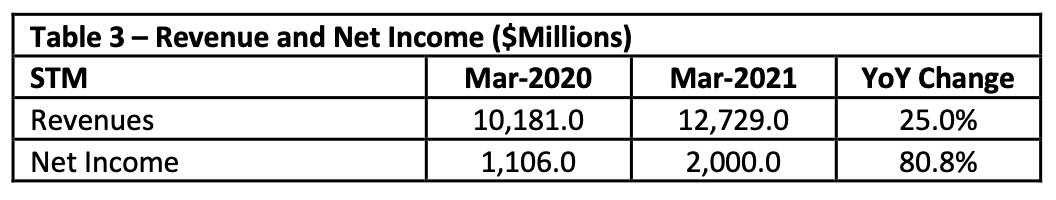 Table 3 shows that STM's revenues increased 25.0% in 2021 and net income increased 80.8% YoY.