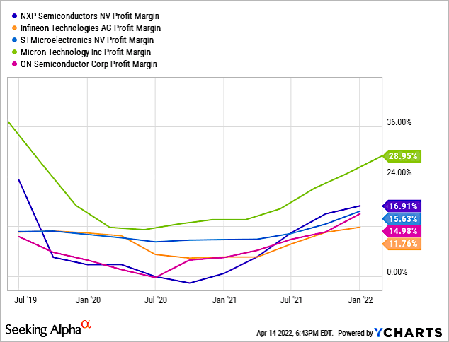 Profit margin for the six companies is shown in Chart 7. Micron's PM at 28.95% was twice that of ON Semi (14.98%) and the other companies.