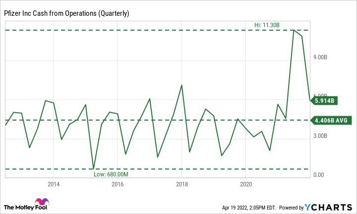 But with health officials now able to administer second booster shots for select groups, it's difficult to tell how long COVID-19will be a problem. The longer that the pandemic lasts, the more Pfizer will see its cash balance grow. As illustrated in the below chart, the company's operating cash flow has surged during the pandemic to reach levels well above where it has been previously.