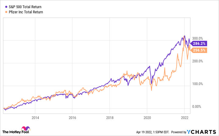 In the past 10 years, Pfizer's stock has done a fairly good job of mirroring the markets, with total returns (which include dividends) coming in just a bit below the S&P 500.