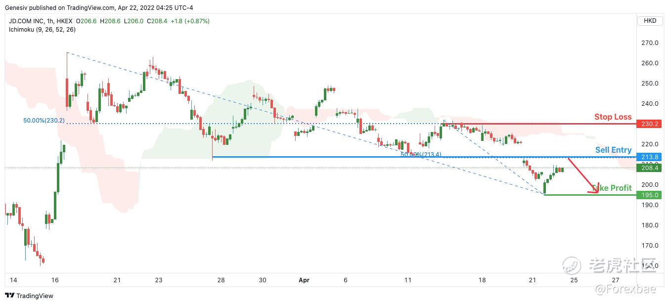 I personally think theres still some room for bearishness with the recent break of the support (our entry) and how price is moving below the ichimoku cloud. Hoping for price to pullback and retest at 230.2 where our entry is lined up with the 50% Fibonacci retracement and pullback resistance and probably play it to the next swing low at 213.2. I'll have my stop loss tight at 195 where the last swing high was which aligns with the 50% Fib retracement.