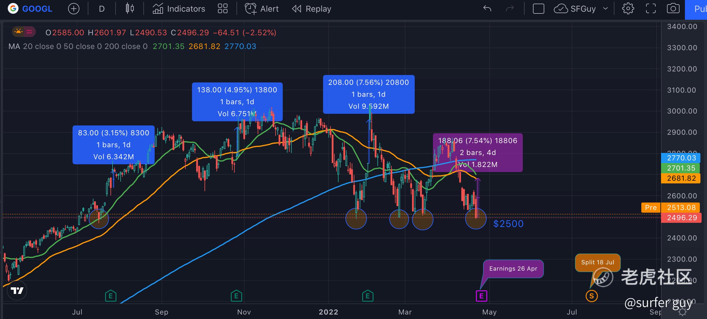 If $Alphabet(GOOGL)$ reports positive earnings and guidance, there are Long opportunities as price would likely “pop” to near 50 SMA lines about 7.54% or $2,651. Such price action is possible as a “pop” of about 7.56% happened after the last quarter earnings beat. On the other hand, if earnings miss or it gives poor guidance, the $2,500 support line might finally break, and presents Short opportunities up to $2,400.