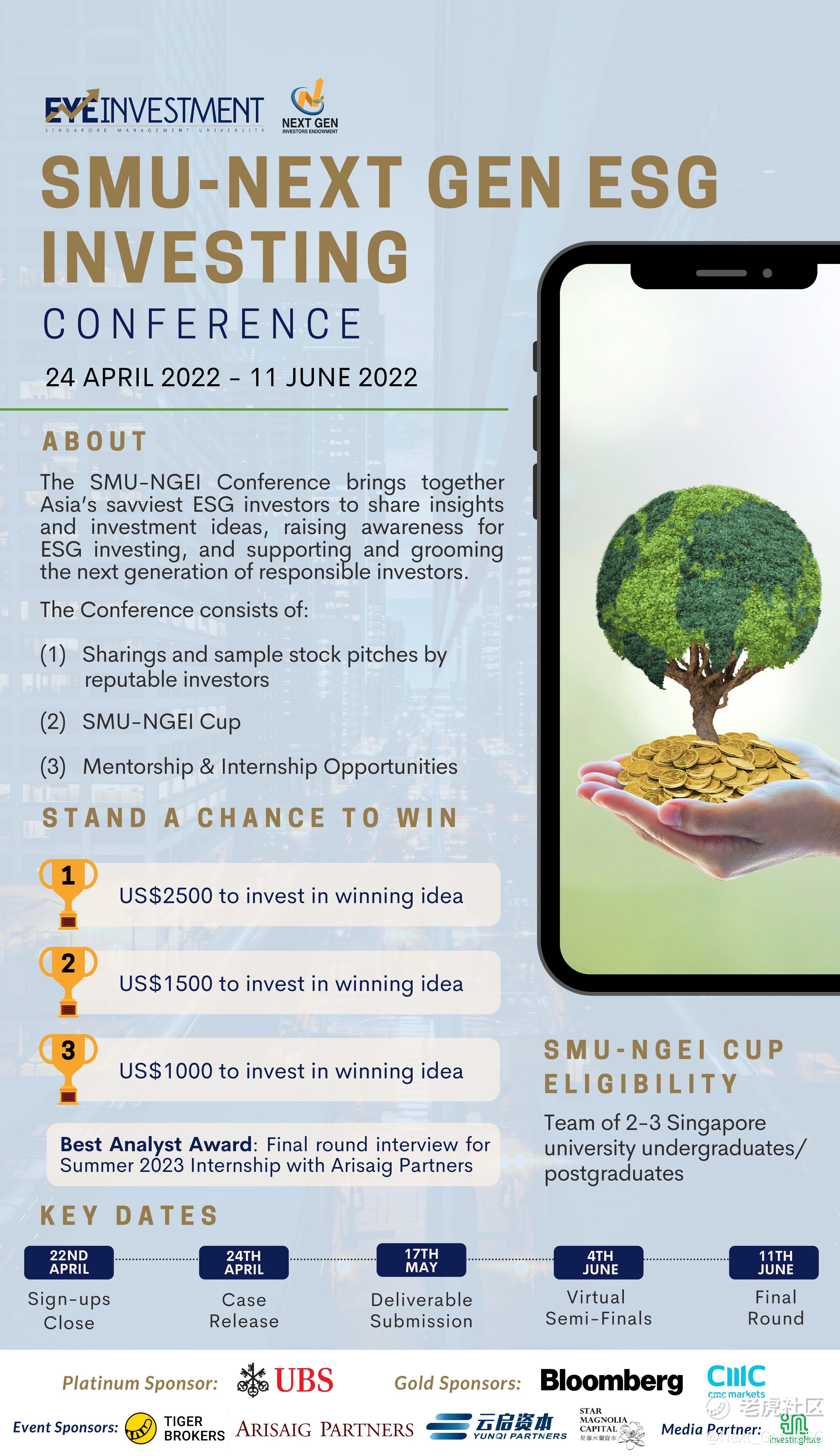 Next Gen Investors Endowment Ltd. and SMU EYE Investment Club are proud to present the SMU Next Gen ESG Investing (SMU-NGEI) Conference, where you will get the chance to participate in the SMU-NGEI Cup (a stock pitch competition), gain Mentorship and Internship Opportunities, and listen to reputable investors share their investment ideas! This event is sponsored by Tiger Brokers.