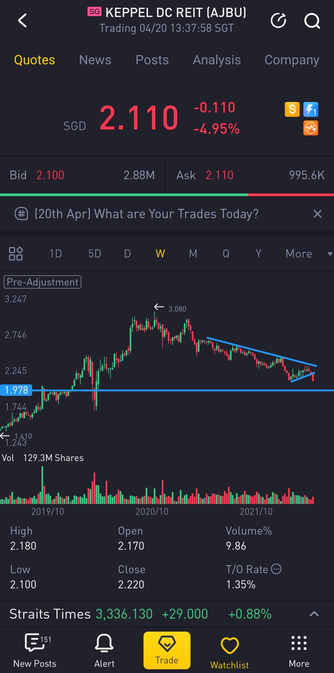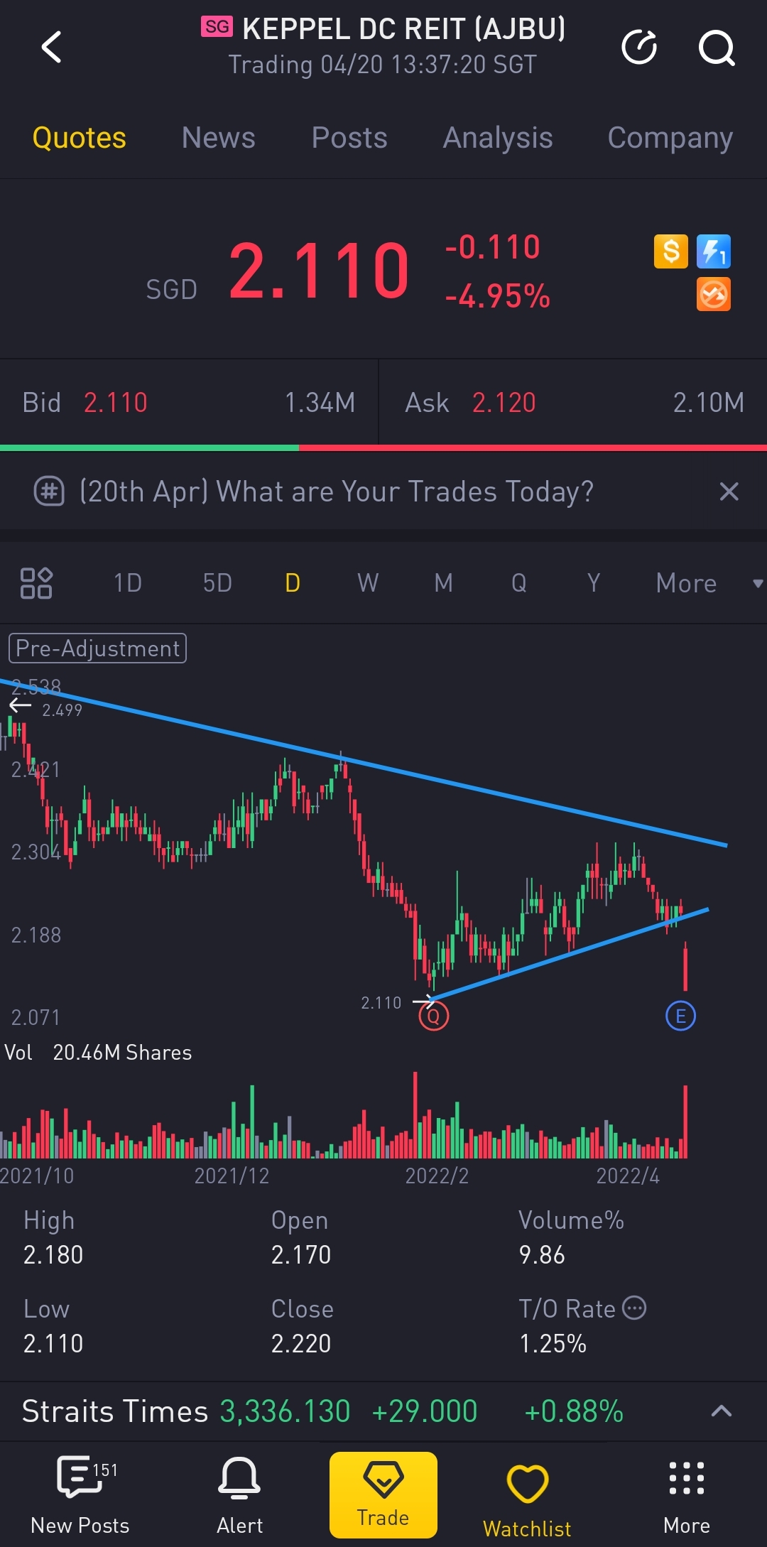 $KEPPEL DC REIT(AJBU.SI)$gapped down today below the uptrend line after posting 2022Q1 results. It reported its first quarter net property income slipped 1.4 percent on-year to S$60.13 million and distribution per unit (DPU) came in at 2.466 Singapore cents, up 0.2 percent from 2.462 Singapore cents in the year-earlier quarter. So why did KDC fall despite increasing dpu?