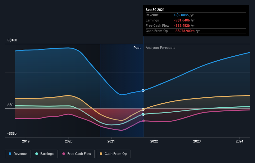 As you can see, institutional investors have a fair amount of stake in Singapore Airlines. This can indicate that the company has a certain degree of credibility in the investment community. However, it is best to be wary of relying on the supposed validation that comes with institutional investors. They too, get it wrong sometimes. It is not uncommon to see a big share price drop if two large institutional investors try to sell out of a stock at the same time. So it is worth checking the past earnings trajectory of Singapore Airlines, (below). Of course, keep in mind that there are other factors to consider, too.