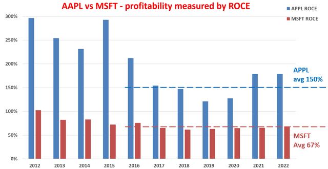 Based on the above considerations, the ROCE of MSFT and AAPL over the past decade is shown below. As seen,