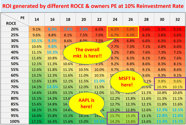 The road map below shows the ROI based on an assumption of a 10% reinvestment rate, which is the average rate for the large and mature businesses in the S&P 500 index. Admittedly, both MSFT's and AAPL’s reinvestment rate (especially APPL) is not as high as 10% currently. So the total ROI would be a bit lower than what is shown in the roadmap below. However, note that both boast strong cash generation capability and fortress balance sheet, which provide the optionality to crank up reinvestment rates or to boost growth through acquisitions.