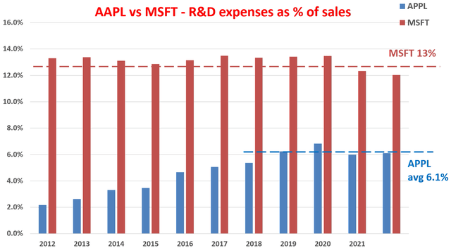 - Then Tim Cook transitioned it to a different model. He more than doubled the R&D expenses since he took over. The R&D expenses are on average about 6.1% of sales now, still lower than other tech giants in relative terms. But in absolute terms, it's amind-bogglingamount (exceeding $20 billion in 2021).