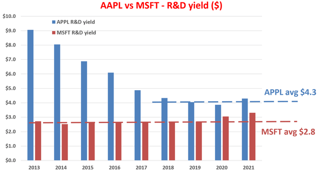- Overall, both AAPL and MSFT enjoy R&D yields that are very competitive. To put things under perspective, for the overachieving FAAMG group, their average R&D yield is “only” about $2.5.