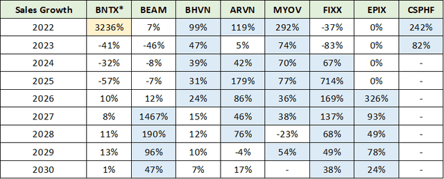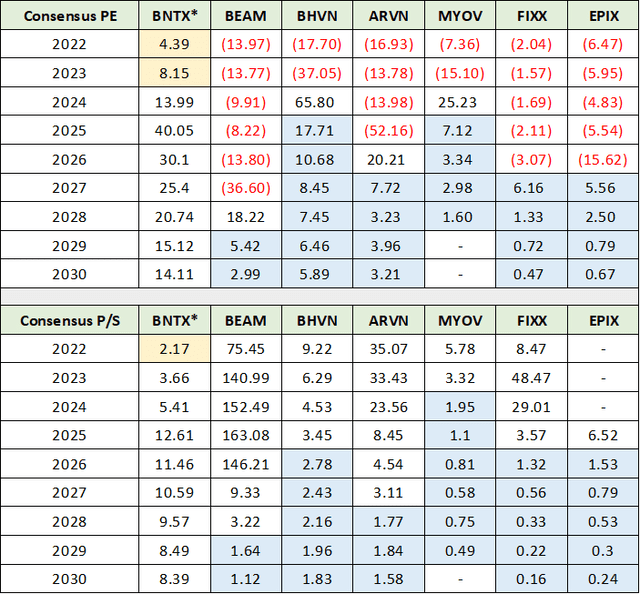 The smaller investments are equally exciting as the two large opportunities discussed above. Rather than review each individually, I have summarized the growth profile of the investments using consensus analyst estimates for sales and earnings provided by Seeking Alpha for each public company investment (BNTX,BEAM,BHVN,ARVN,MYOV,FIXX,EPIX, andCSPHF). This summary approach captures the essence of Pfizer’s aggressive growth strategy by viewing the growth profile of its investment targets. In the first table, I have highlighted in blue the years for which extraordinary sales growth is forecast for each company.