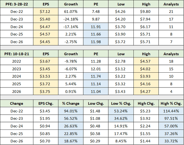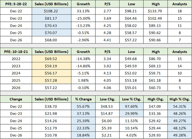Please note that the change in sales estimates in the lower portion of the table are in billions of USD. The consensus analyst estimates for 2022 and 2023 have increased by $39 billion and $22 billion, respectively. On a percentage basis, estimates have increased materially through 2026 (highlighted in blue). From my prior Pfizer report: