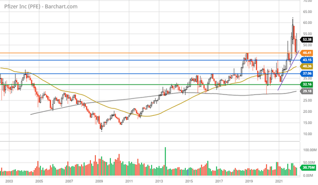 Pfizer 20-year monthly chart(Created by Brian Kapp using a chart from Barchart.com)