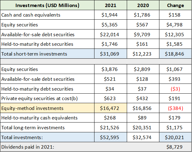 While the company did not provide free cash flow guidance for 2022, it appears to be incredible with earnings estimated at over $37 billion when applying a similar earnings to free cash flow relationship as was the case in 2021. This cash flow will be added to a balance sheet with over $52 billion of investments as of year-end 2021. The balance sheet investment details and changes compared to 2020 are summarized in the following table compiled from Pfizer’s 2021 10-K filed with the SEC. I have highlighted in blue the summary investment information.