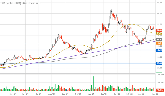 Pfizer 1-year daily chart(Created by Brian Kapp using a chart from Barchart.com)