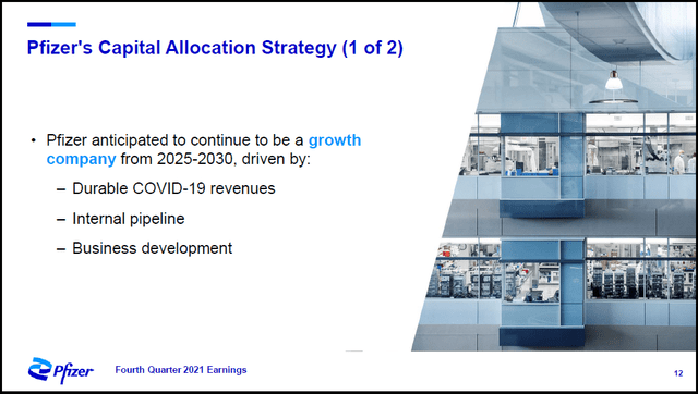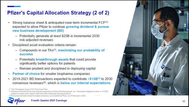 The following two slides from Pfizer’s Q4 2021 investor presentation summarize the investment framework for the coming growth cycle. In the first slide highlighted in blue, Pfizer explicitly commits to maintaining and expanding its growth profile through the end of the current decade. Internal research and development is a given, while the business development expansion vector was touched on above in covering recent investments and acquisitions.