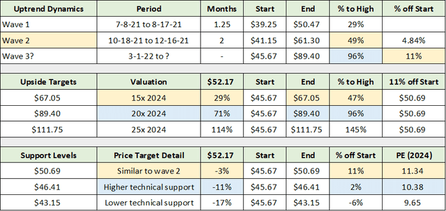 Please note that in the lower two sections the $52.17 column represents the return potential to each of the price targets in the far-left column, respectively. This return column defines the potential return spectrum from the current price of $52.17. I have highlighted in blue what I view as the most likely potential return range looking out 1-3 years. This return spectrum is -11% to +71%.