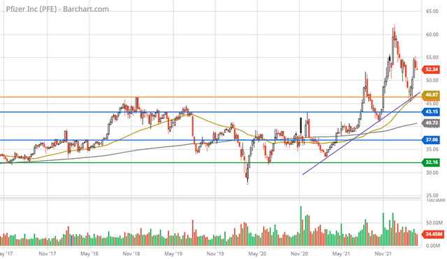 Pfizer 5-year weekly chart(Created by Brian Kapp using a chart from Barchart.com)