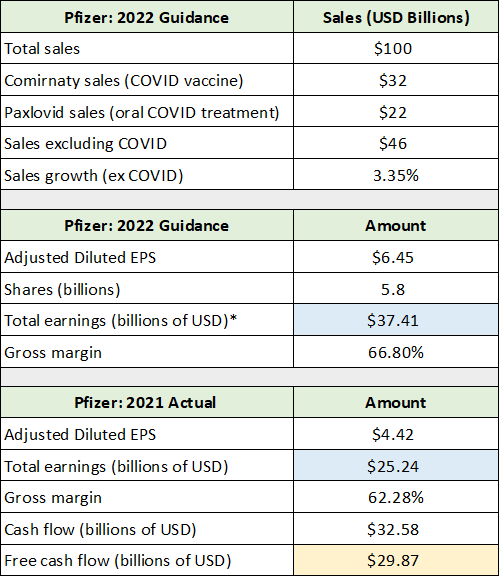 Pfizer’s guidance for 2022 is for over $37 billion of earnings using its per share earnings and share count projections. This compares to $25 billion in 2021 in which Pfizer generated $30 billion of free cash flow. In the table below, the earnings figures are highlighted in blue and the free cash flow for 2021 is highlighted in yellow. The table was compiled from Pfizer’s Q4 2021 8-K filed with the SEC.
