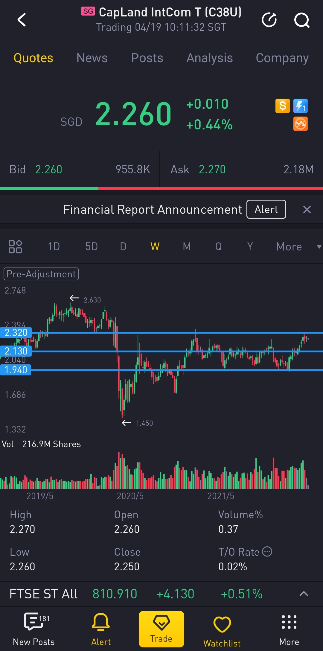 $CapLand IntCom T(C38U.SI)$Since hitting 1.92 low in early Feb 2022 on fears of steeper than expected interest rate hikes, CICT has been on a relentless upward climb aided by reopening news and return back to office. In early Apr 2022, it touched the 2.30s upper bound of the horizontal trading range but has since got rejected. The 2.32 region is also a support in 2019 that has now turned resistance. Aided by increasing rents and yield accretive acquisitions, it should only be a matter of time before CICT trades at 2019 levels again. Any retracement is likely to be supported around the 2.10 to 2.15 region where it traded for a good portion of 2021, barring any steeper than expected interest rate hikes. Assuming 10.4c annual dividend, the yield would be around 4.9% at 2.12.