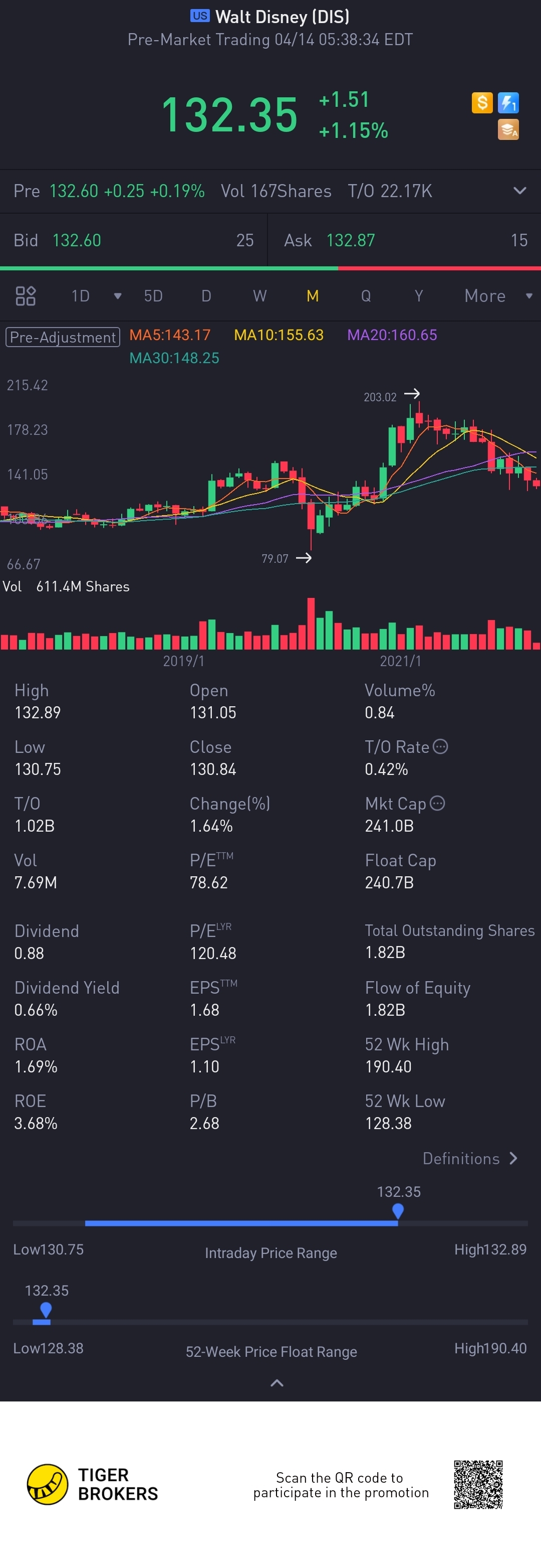 Base on financial service providers $Walt Disney(DIS)$has a fair value of between $170-190. Their last closing price is around $130 which give them an average discount of 28% below their fair valuation.